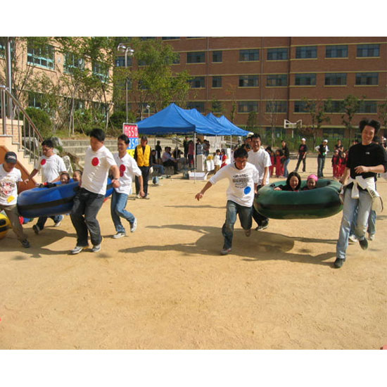 ② 팀대표 선수 4인은 양사이드 손잡이를 각 1개씩 잡고, 다른 1인은 튜브에 올라가 양쪽